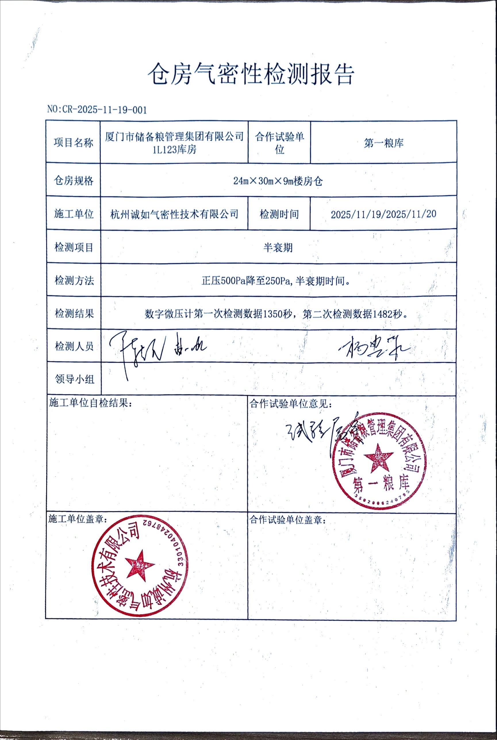 厦门市储备粮管理集团有限公司1L123库房正压500Pa半衰期降至250Pa测试结果为1350秒。